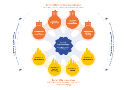 En daarvoor is het vormen van een leergemeenschap, in alle lagen van het project/programma, cruciaal. Van Woerkum: ‘Onze leergemeenschappen zijn zo ontworpen dat de mensen die met elkaar van doen hebben ook daadwerkelijk bij elkaar zitten; een uitgekiende samenstelling van opleiders, leraren, schoolleiders en onderzoekers, zodat onderzoek, opleiding, leiderschap en lespraktijk zich hand in hand ontwikkelen. Maar we hebben ook een leergemeenschap van opleiders, een leergemeenschap van onderzoekers, een leergemeenschap van schoolleiders, en werkplaatsen waarin opleiding en scholen binnen een regio samenwerken.’